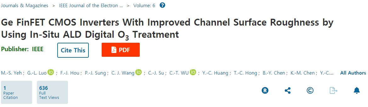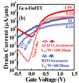 본 기술논문에서는 E-beam lithography와 Dry Etch로 Ge epitaxial layer를 Fin 모양 channel로 형성한 뒤 in-situ ALD로 오존 처리해 GeO2를 형성합니다.