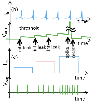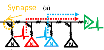 뉴런(신경세포)은 서로 연결된 접합부인 시냅스에서 수상돌기(Dendrites)를 통해 신호를 받아 시간으로 적분하고, 이 값이 문턱값(threshold)을 넘으면 스파이크(Spike) 전압을 발생시킵니다.