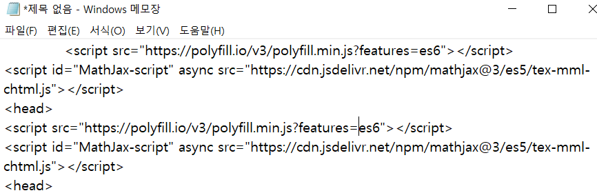 수식 입력 설정 방법 블로그 관리 -> 꾸미기 -> 스킨 편집 -> html 편집으로 들어갑니다. 왼쪽 사진 체크한 곳 사이에 이걸 삽입해줍니다. 오른쪽 사진처럼 되도록 이후, 블로그 글쓰기로 들어가서 $