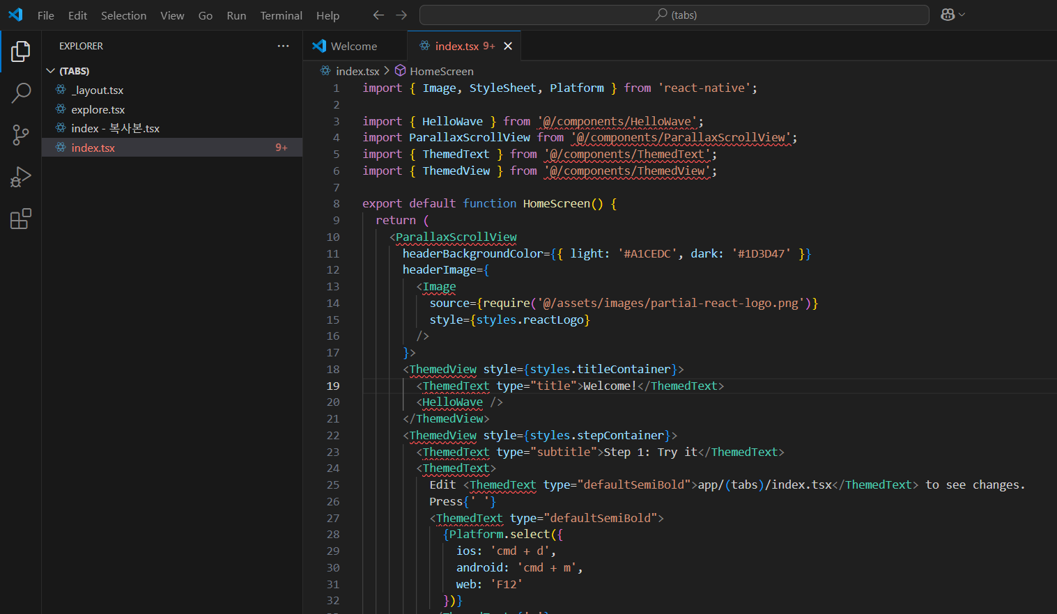 VScode로 app/(tabs)에 index.tsx를 open