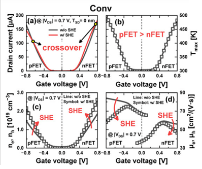빨간색 NFET과 파란색 PFET이 SHE(열 받을때)의